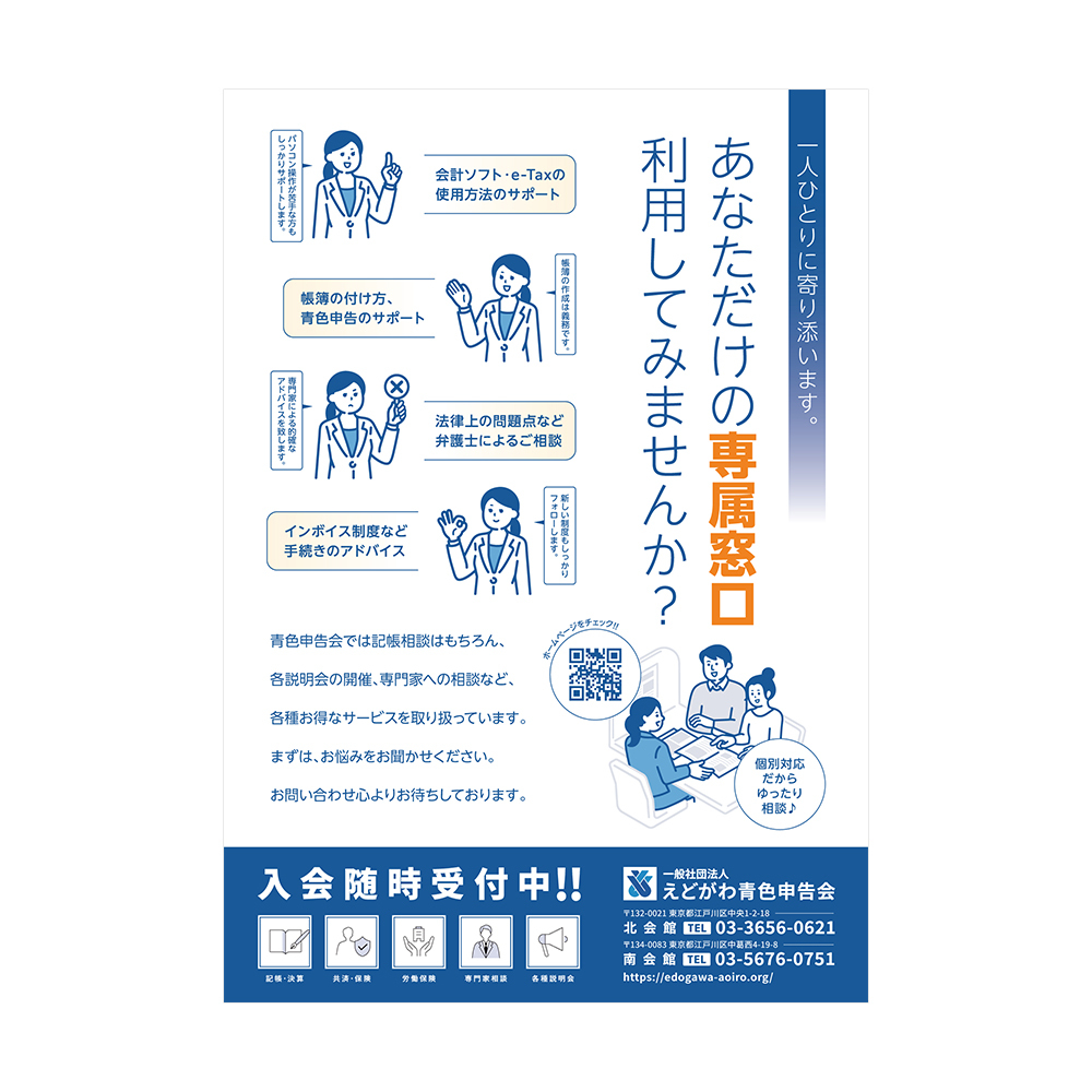 えどがわ青色申告会様の入会促進ポスターデザインをお手伝いさせていただきました。